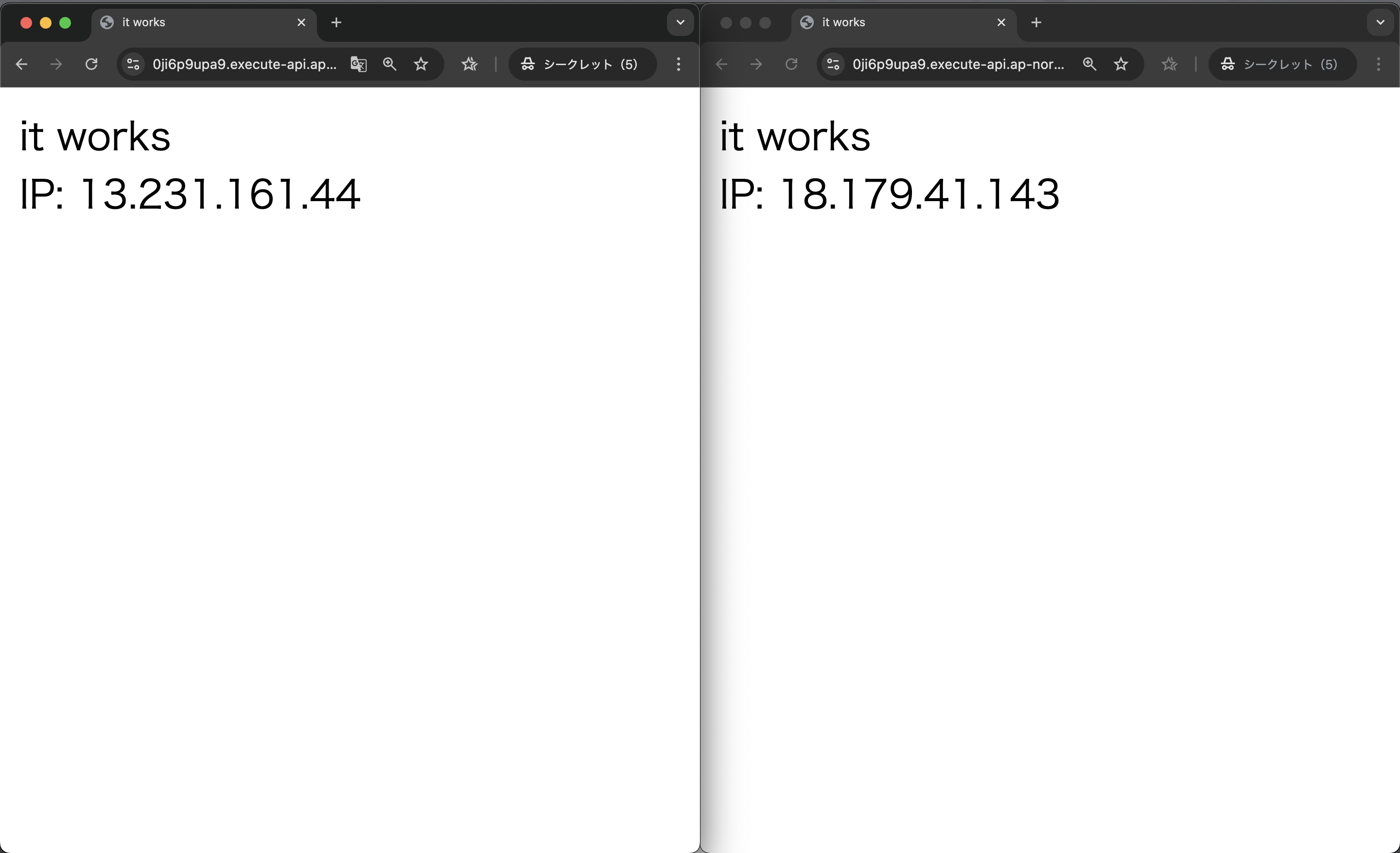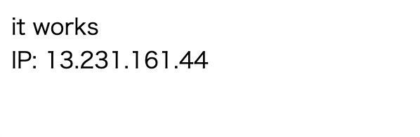 アクセスできました。後々の検証のため、レスポンスでIPアドレスを表示させています。