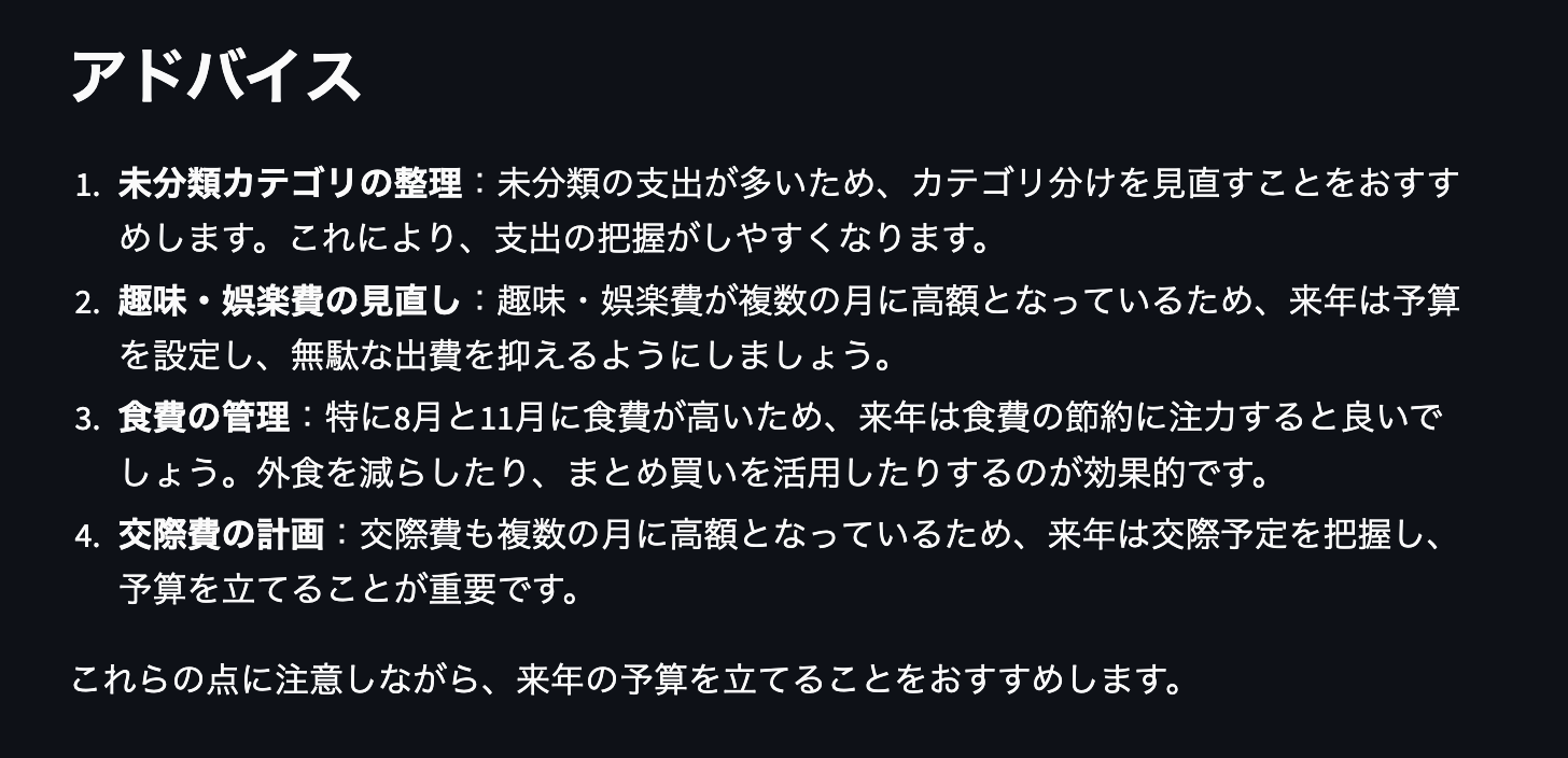- 食費の管理 : 特に8月と11月に食費が高いため、来年は食費の節約に注力すると良いでしょう。