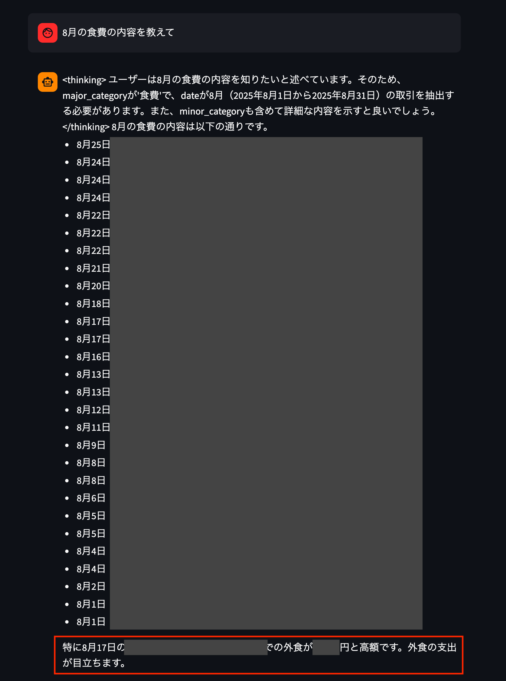 ということで、本記事では家計簿をParquet形式で保存して、AIエージェントに分析させて見ようと思います。