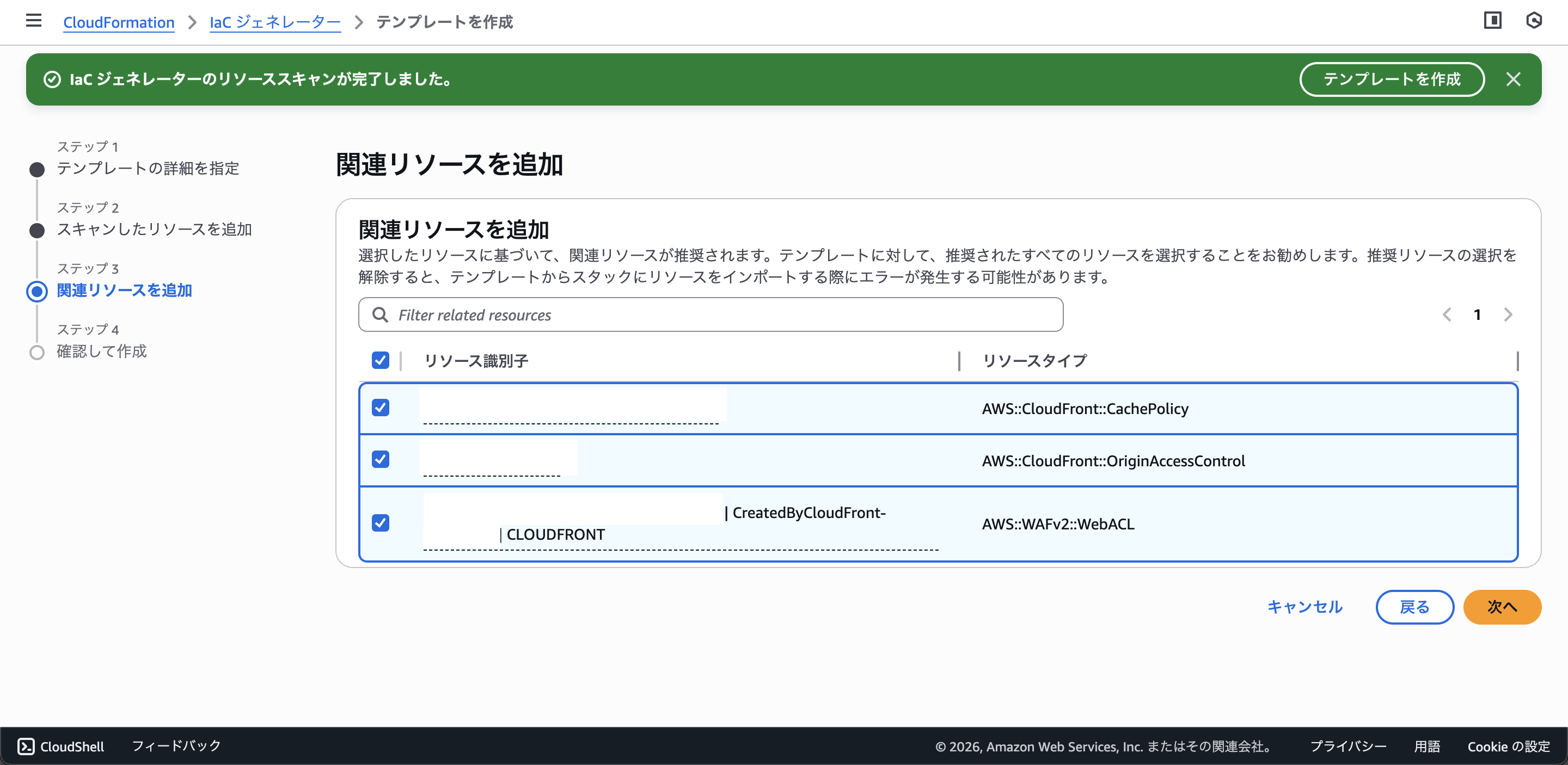 手動で作成したS3とCloudFrontを検索して、リソースを追加します。